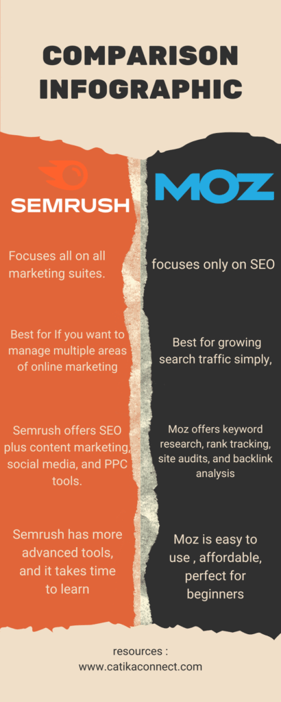 • Moz: focuses only seo, simpler and beginner-friendly. suitable if your goal is improving your Google rankings and you want something a bit simpler.