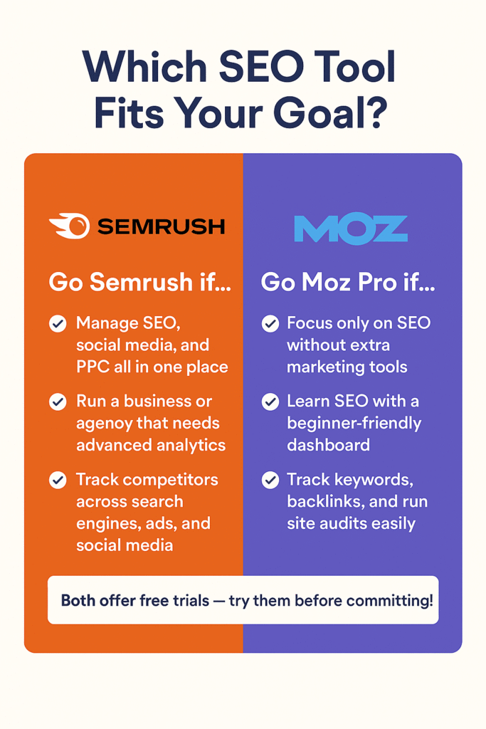 yes! Both Semrush and Moz Pro offer free trials so you can test their features before paying. Start your Semrush free trial or try Moz Pro free here. this is a great way for beginners to see which seo tool feels easier and fits their needs without risk.